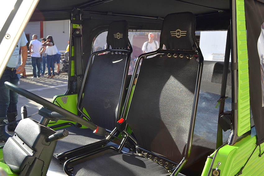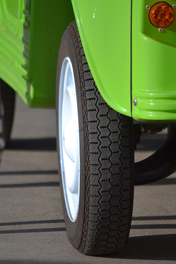 En ordre de marche (avec donc la batterie), la e-Mehari accuse 590 kg sur la balance, ce qui explique sa relative nervosité malgré son petit moteur. Ce moteur est accouplé à un réducteur silencieux (pignons à taille hélicoïdale). Pas de boîte de vitesses, les 87 Nm de couple du moteur électrique font qu’on s’en passe très bien. Pour respecter la limite de poids, et conserver l’esprit de la «vraie», la e-Mehari n’offre aucun des éléments de confort et même de sécurité habituels: pas de clim, pas d’airbag, etc. seules concessions à la modernité: un compteur digital et la direction assitée, électrique bien sûr.
