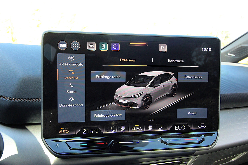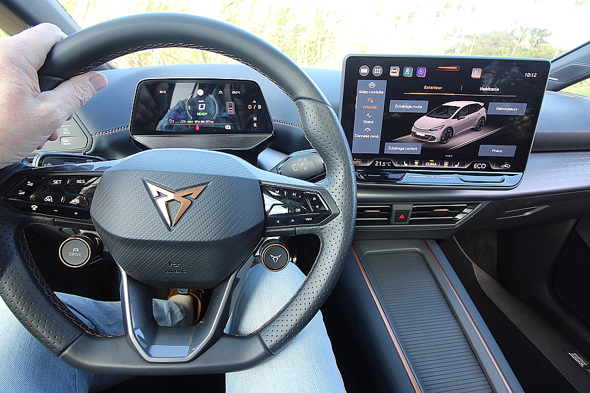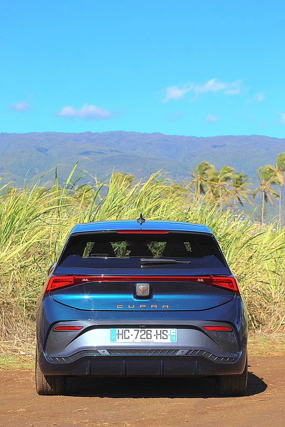Elle passe de 0 à 100 km/h en 7,1 sec, avec la batterie XL de 77 kWh comme sur notre voiture d’essai. Sa grande autonomie de 560 km sera largement suffisante pour faire plus de 2 fois le tour de l’île. Même avec une si grande batterie, ça accélère très fort au feu rouge ! Elle mérite son badge Cupra.