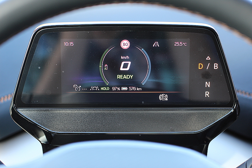 Pour mettre en route, il suffit d’appuyer sur la pédale de frein et tourner le petit levier à droite sur la colonne de direction sur la position D (Drive) ou R (Recul). Le frein à main se met et s’enlève automatiquement. La caméra de recul a une bonne qualité d’image, avec des lignes directrices qui suivent les mouvements du volant. La Born dispose aussi de l’aide au stationnement et toutes les aides à la conduite, notamment la lecture des panneaux de vitesse, pratique, voire indispensable car le confort et le silence font que l’on peut facilement dépasser la vitesse autorisée sans s’en rendre compte.