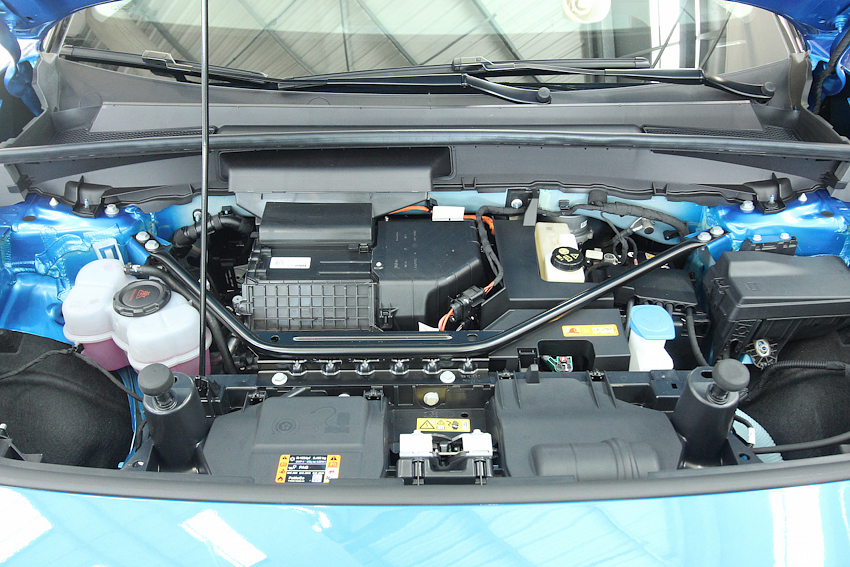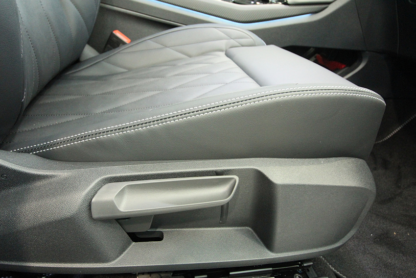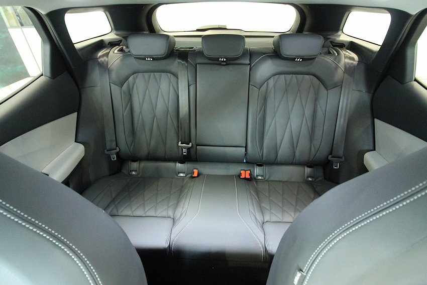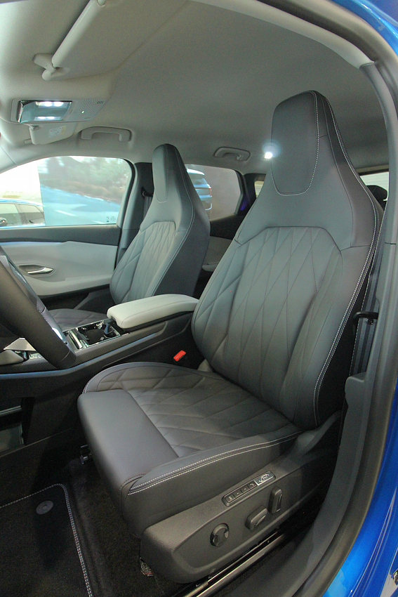 Comme la plateforme est conçue spécialement pour les voitures électriques, il n’y a pas de tunnel centrale, le plancher est plat et la place du milieu sur la banquette arrière peut recevoir un adulte. Il sera juste un peu moins confortablement assis que ses voisins de gauche et de droite car le dossier de la place centrale est plutôt un accoudoir avec des porte-gobelets que l’on peut replier, mais cela reste très correct. Au dos de la banquette, dans le coffre, on trouve à ce niveau la «trappe à skis», permettant de transporter des objets longs, comme des cannes à pêche sous nos latitudes.