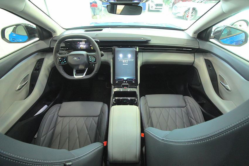 Le design est assez sobre, l’Explorer ne risque pas de choquer les clients, ni de faire de l’ombre à la Mustang Mach-e. C’est sobre mais réussi, avec notamment une face avant qui indique clairement qu’on a affaire à une électrique.