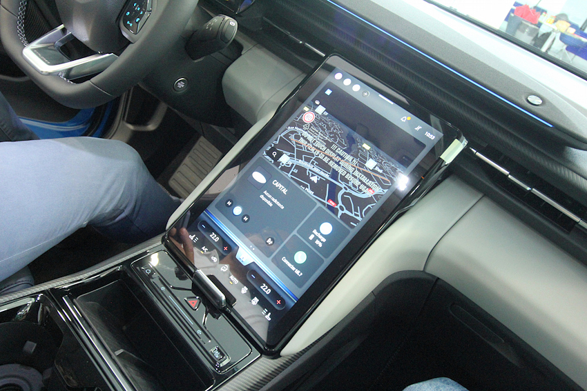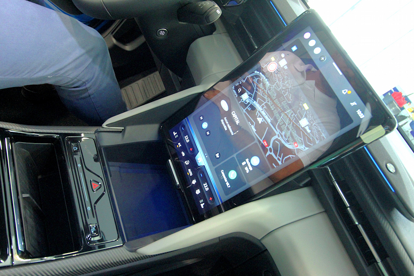 À l’intérieur, c’est spacieux, avec plein de rangements partout et un écran central de 14,6 pouces en position vertical. La grandeur de l’écran est particulièrement pratique pour suivre le chemin indiqué par le GPS, d’autant plus que lorsque le contact est mis, on peut faire coulisser l’écran vers le haut, pour être plus visible. Mais ce n’est pas tout : on fait ainsi apparaître un rangement secret, suffisant pour y cacher de menus objets. Ce n’est pas un coffre-fort mais cela va empêcher le «vol à la roulotte» car «pas vu, pas volé».