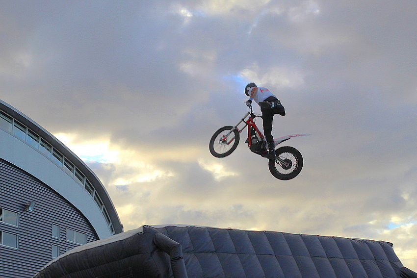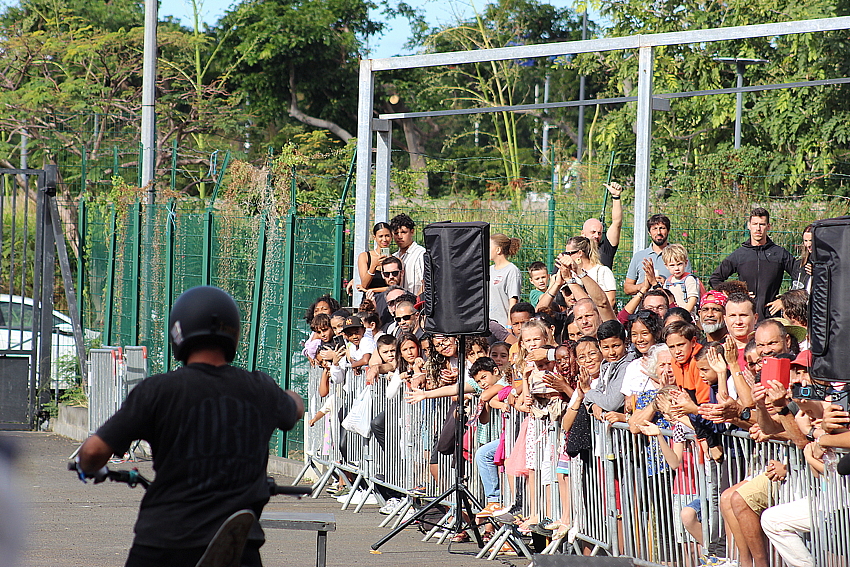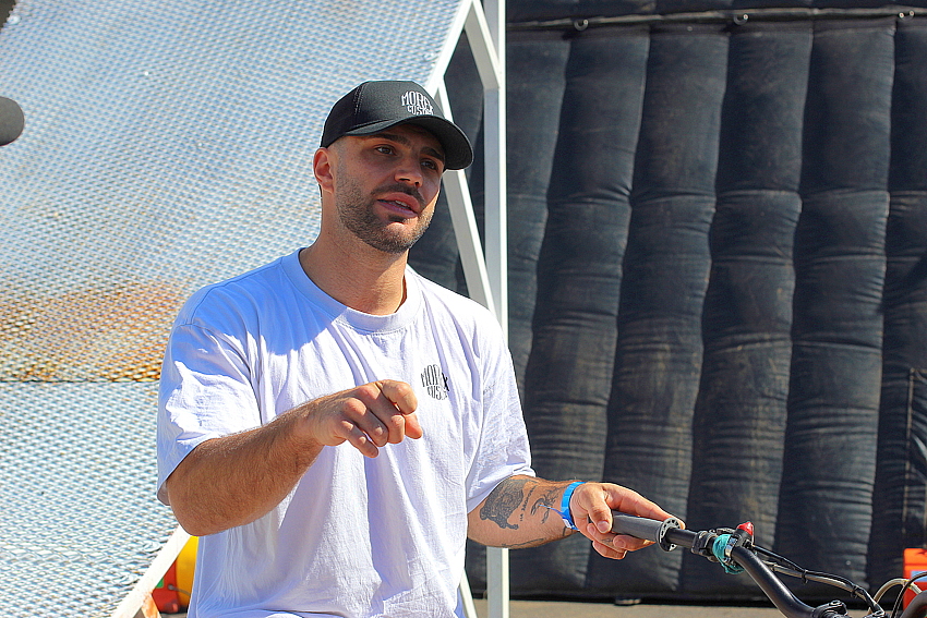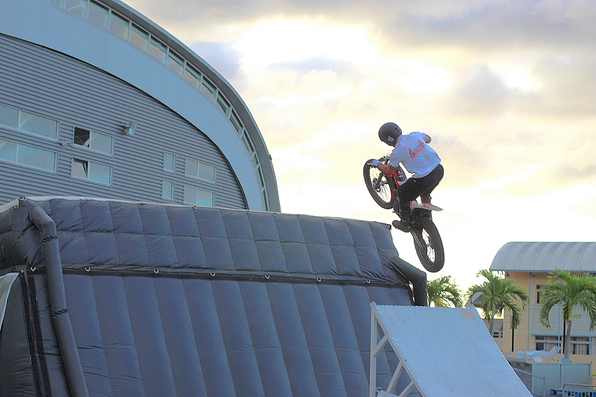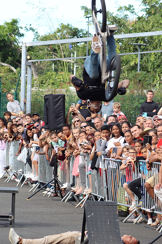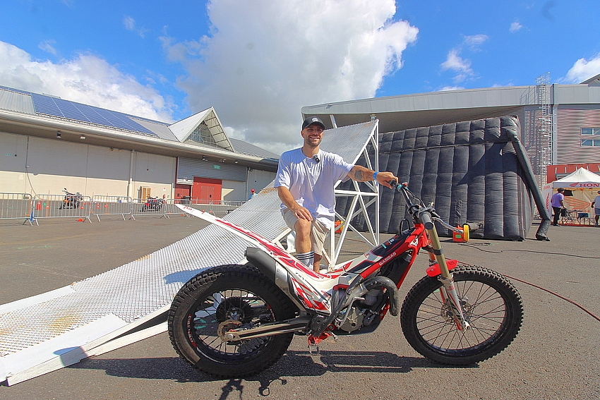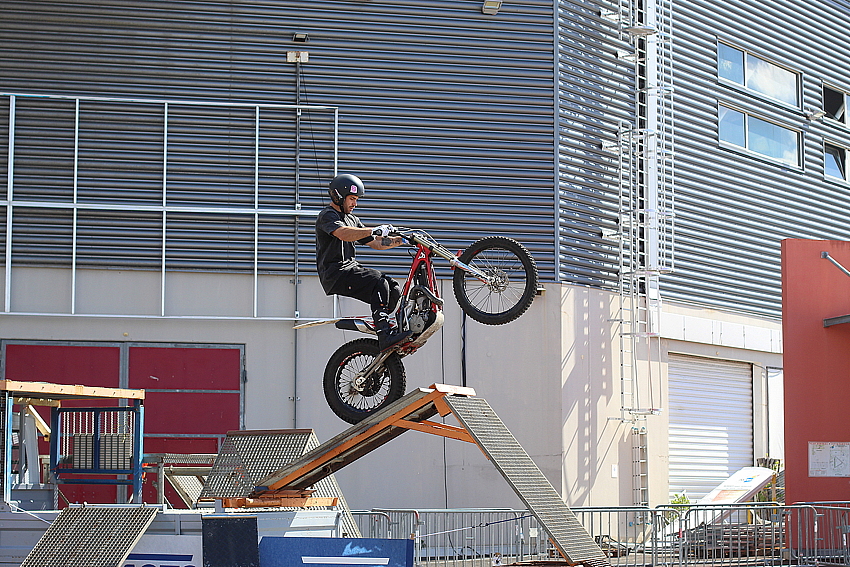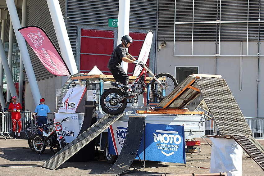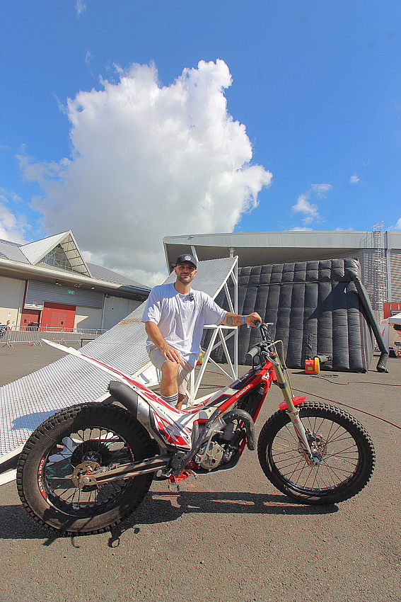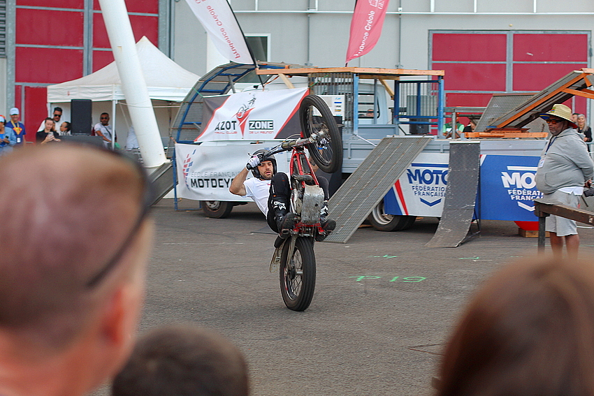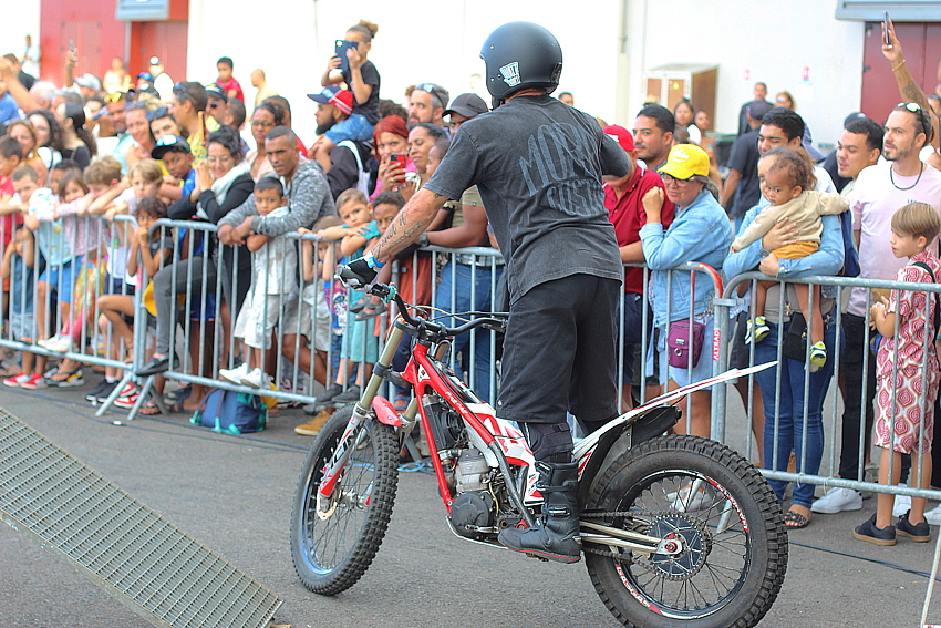 En tous cas, il en faut du courage pour effectuer toutes ses cascades. Il fait voltiger sa trial GasGas TXT racing 250 dans les airs comme il fait voltiger ses adversaires sur le tatamis (car il est également judoka). Pour Motor Expo, le freerider a enchaîné les shows pendant les trois jours, avec toujours la même fougue, la même précision, changeant simplement de tee-shirt entre chaque show, car complètement trempé. Stéphace Fontaine, notre freestyler péi, a complété le show avec ses prouesses en BMX.