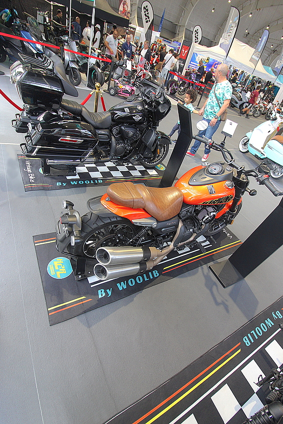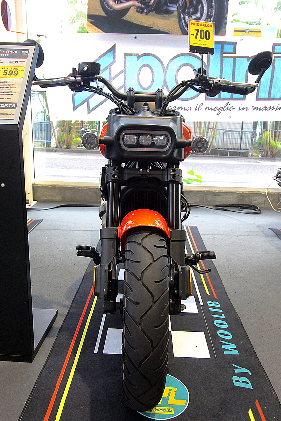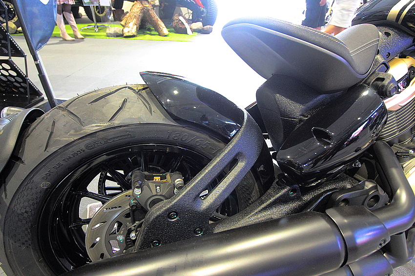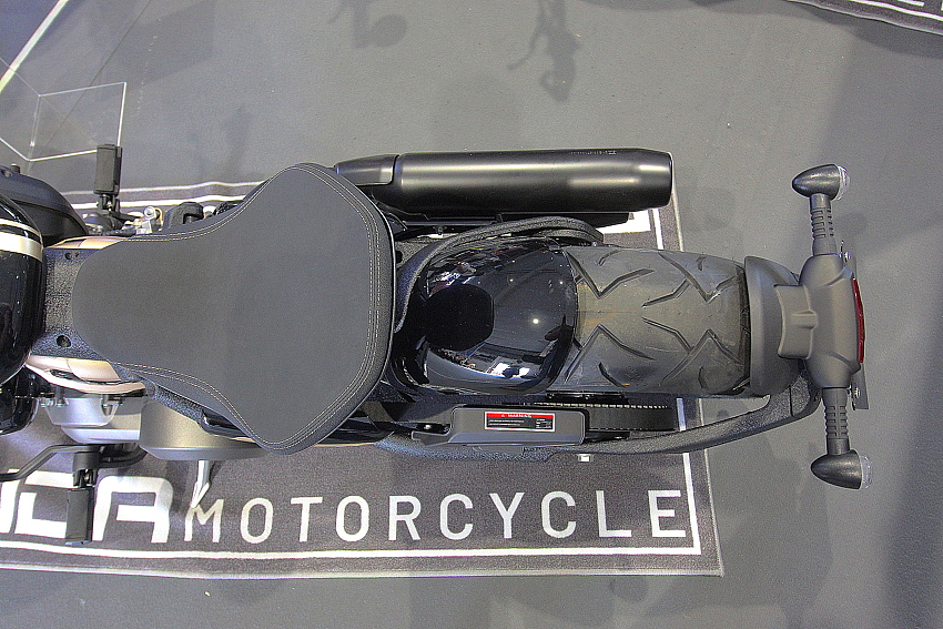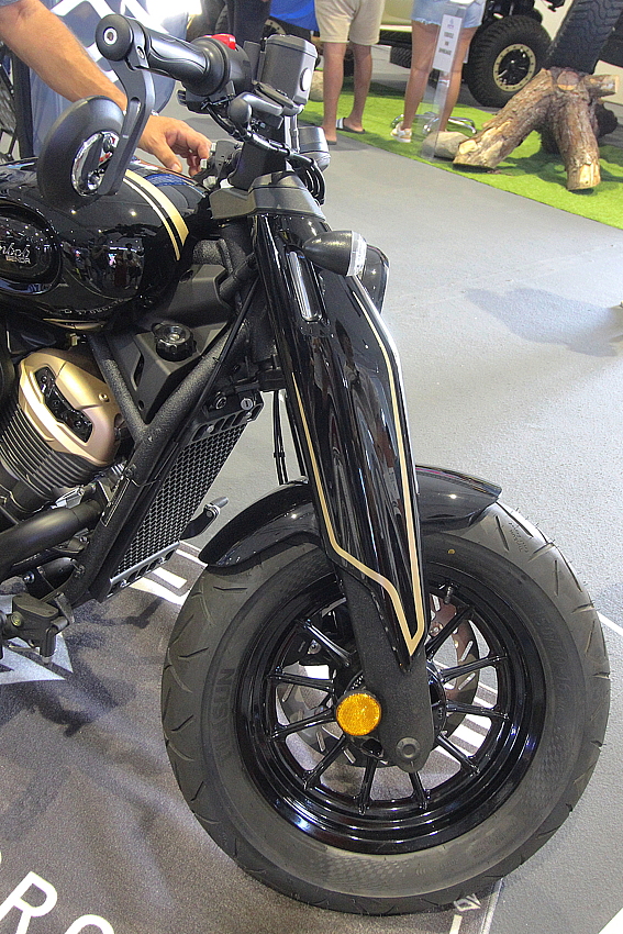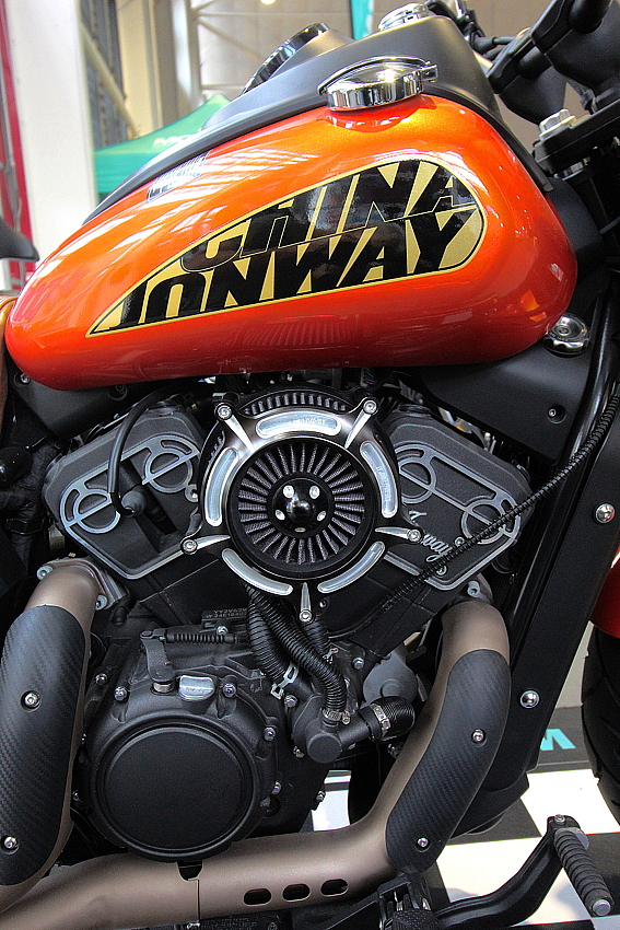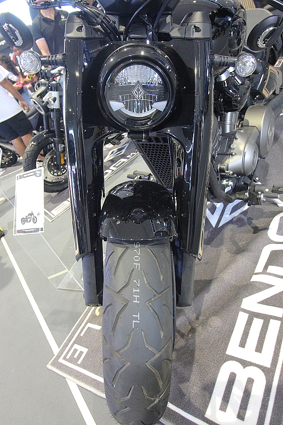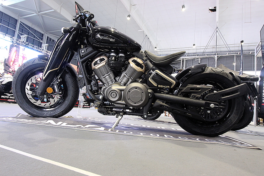 Si la sculpturale LFC 700 était le «eye catcher» du stand Benda, avec son look de dragster (pneu arrière de 310 mm de large) et son imposant moteur 4 cylindres en ligne de 700 cc, nous nous sommes attardés sur la Napoléon V-Twin 500 cc et son look de bobber.
