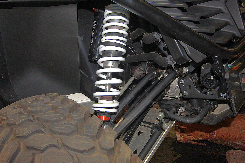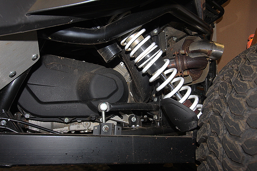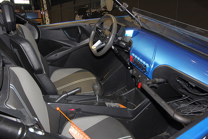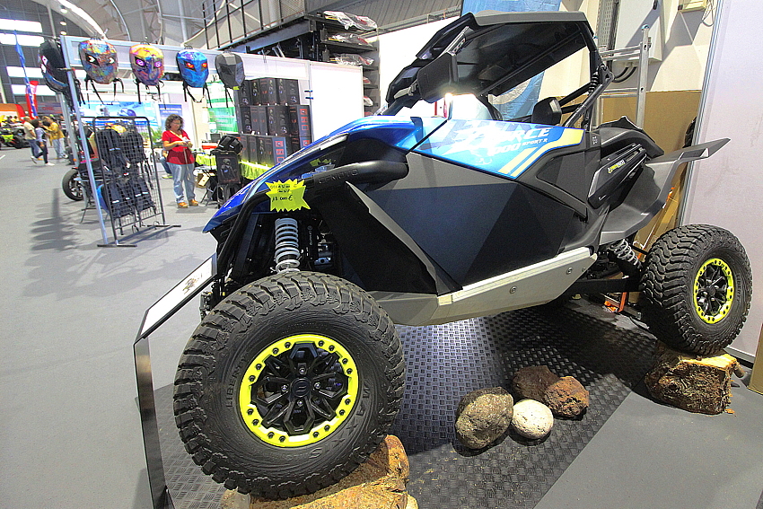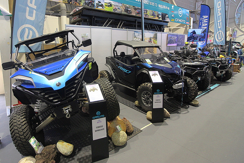 CF Moto propose des quads classiques (avec un guidon) et un petit monstre qui ressemble à un proto de trial, capable de grimper aux arbres avec ses 4 roues motrices, sa boîte de vitesses automatique CVT, ses 90 ch et ses 87 Nm de couple. La garde au sol est de 34 cm, les suspensions sont à double triangle à l’avant et à bras tirés à l’arrière, avec 4 gros amortisseurs à gaz réglables. Et si par hasard vous arrivez à le «planter», il y a un treuil électrique pour vous en sortir.