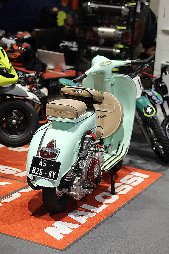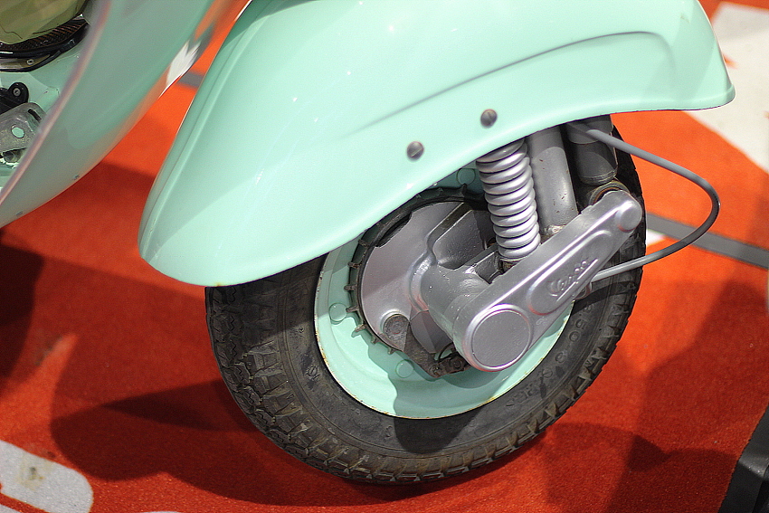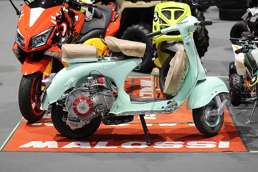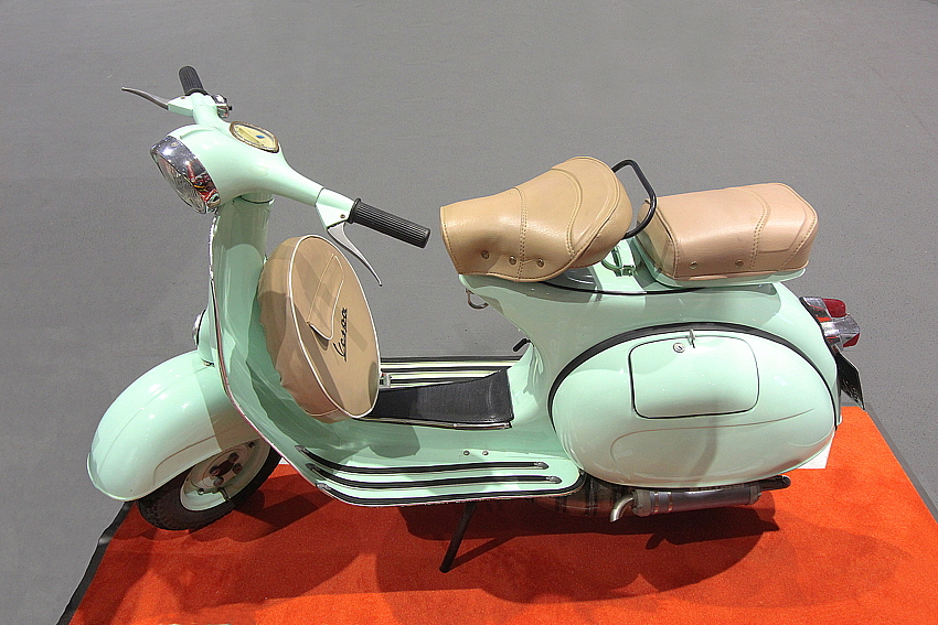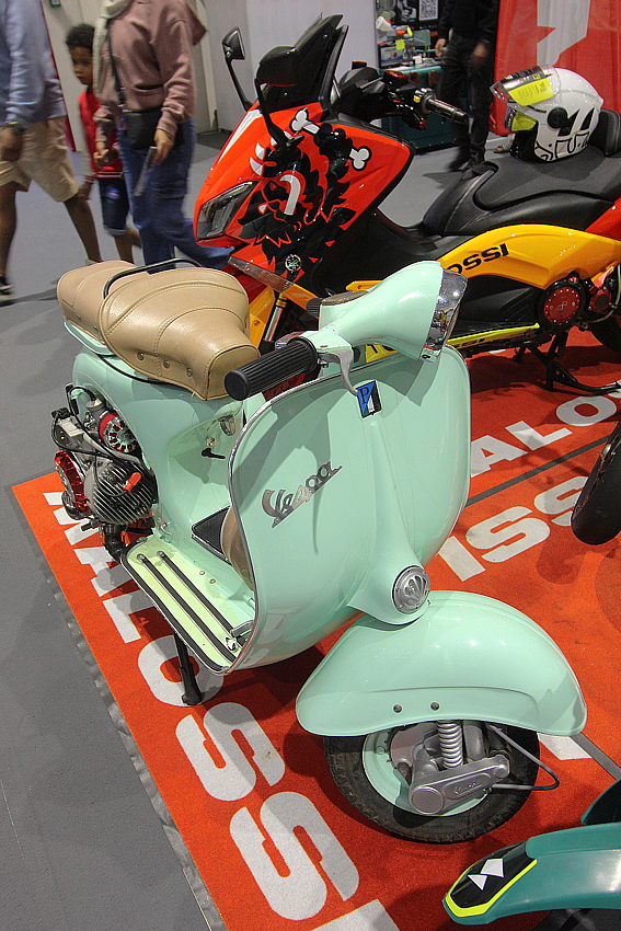 Au hasard des stands d’accessoires, nous avons flashé sur cette magnifique petite Vespa di Piaggio des années soixantes, couleur «verde pastello», à 3 vitesses au guidon, un scooter rendu célèbre au cinéma (« Vacances Romaines » et « La Dolce Vita») et commercialisé jusqu’au 1er janvier 2017, où l’entrée en vigueur des normes Euro 4 a malheureusement signifié sa mort, du moins en Europe, car il continue à être fabriqué en Inde.