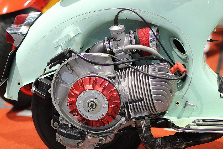 Cet exemplaire exposé à Motor Expo 2025 est restauré à neuf et même amélioré, avec un kit ventilateur Vespower 167 MHR de chez Malossi, non plus en plastique mais en aluminium (meilleure dissipation de la chaleur), anodisé rouge et diamanté au centre, comportant 12 pales principales qui alternent avec 12 pales secondaires. On voit aussi un carburateur Dellorto VHSH 30 CS, ce qui indique que le kit cylindre-piston-culasse Malossi doit cuber au minimum 125 cc.