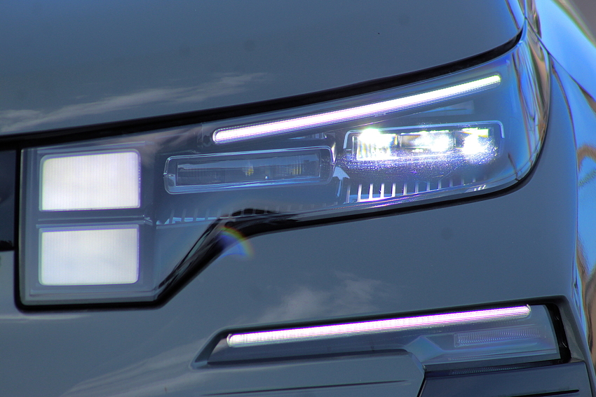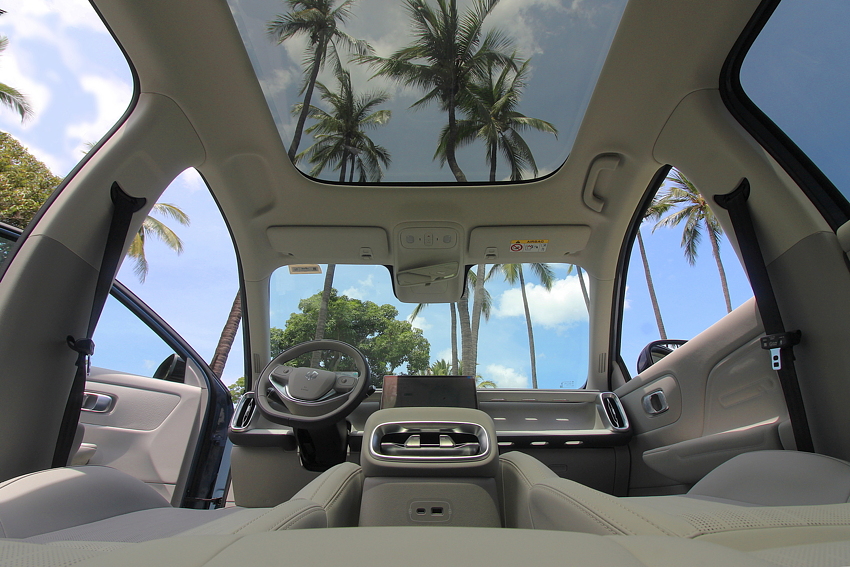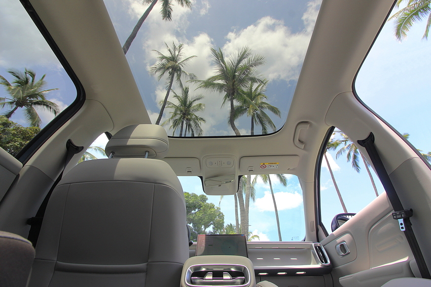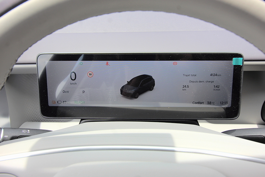 Notre modèle d’essai était celui présenté lors de la conférence de presse, donc avec le magnifique intérieur blanc ivoire et l’immense toit panoramique. D’emblée, cela donne à l’habitacle un charme irrésistible. Le designer a opté pour un intérieur minimaliste, sans aucun bouton hormis ceux au volant, tout est commandé via l’écran central tactile. Quand je dis tout, c’est vraiment tout : même pour régler les rétroviseurs, il faut d’abord sélectionner cette fonction sur l’écran central et ensuite on fait le réglage via les deux boules au volant.