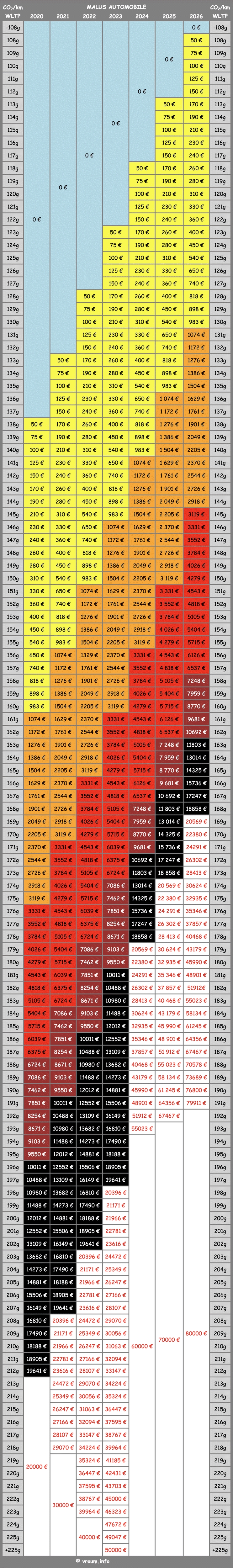 3e acte de la tragédie, de 2020 à 2024, le malus (maintenant calculé selon les normes WLTP) poursuit sa course folle, avec un seuil de déclenchement de plus en plus bas et un malus maximum de plus en plus punitif : 20.000 €, 30.000 €, 40.000 €, 50.000 € et 60.000 € en 2024 (Projet de Loi de Finances).